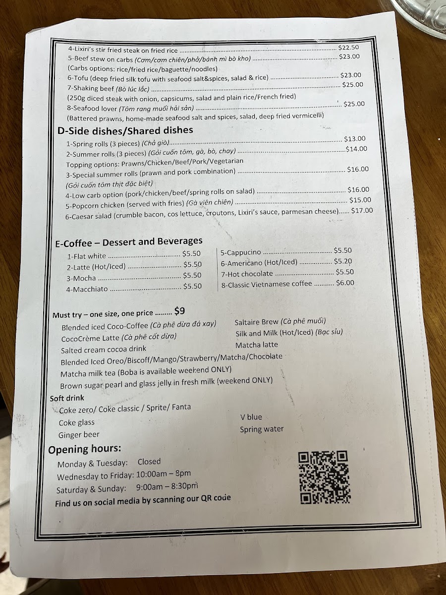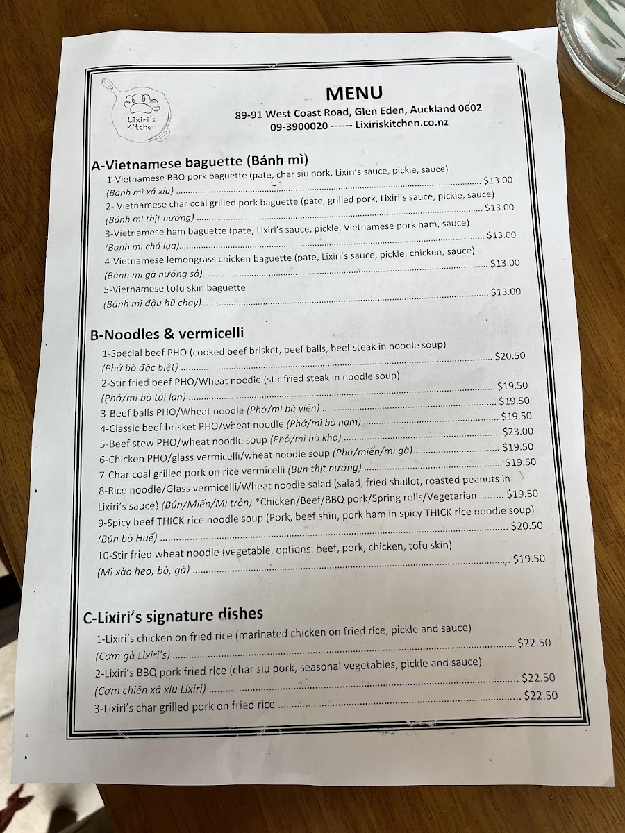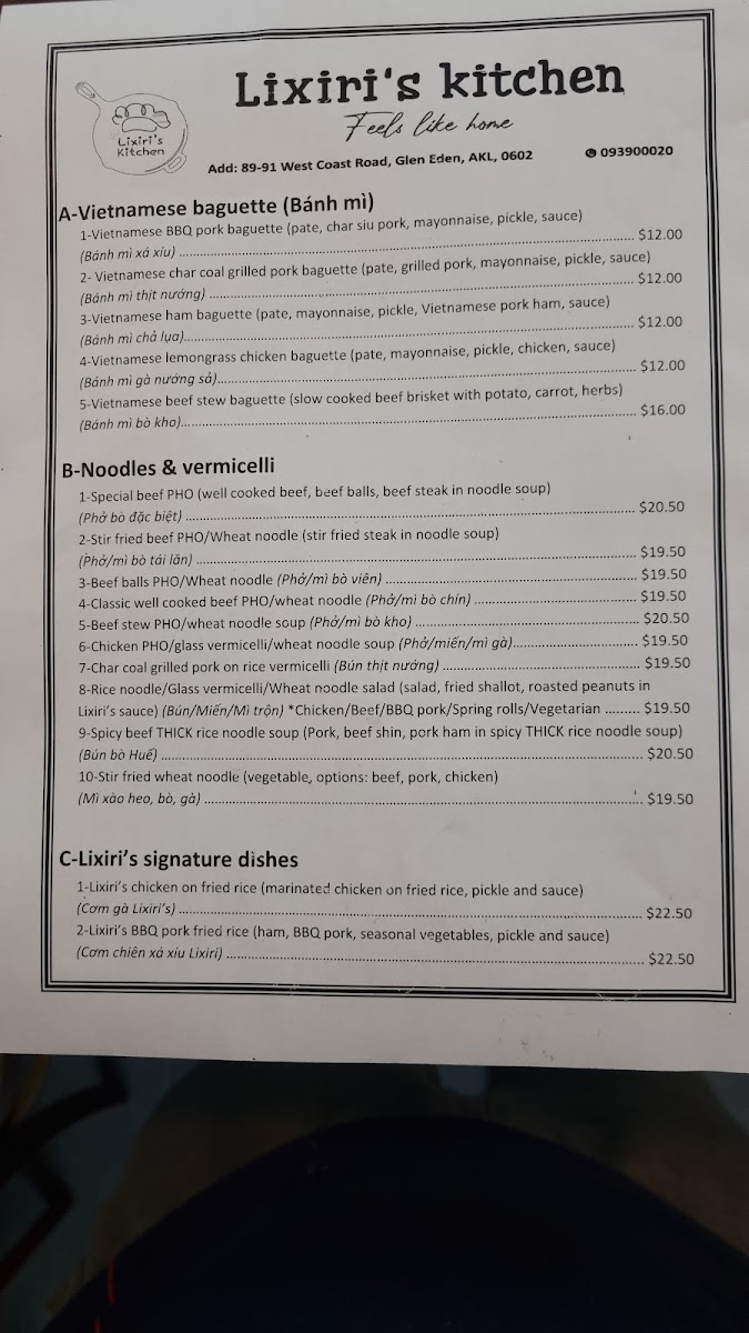 Welcome to Lixiri's Kitchen, a delightful Vietnamese eatery located at 89 West Coast Road in Glen Eden, Auckland. This haven for noodle lovers offers an array of authentic comfort food, from the rich and flavorful Spicy Beef THICK Rice Noodle Soup to the refreshing Charcoal Grilled Pork on Vermicelli, marinated to perfection with a secret blend of spices. The menu also features must-try beverages like the Cococrème Latte and the savory Saltaire Brew, both sure to satisfy your sweet cravings.